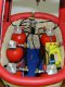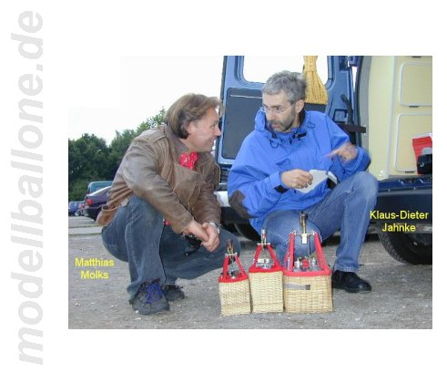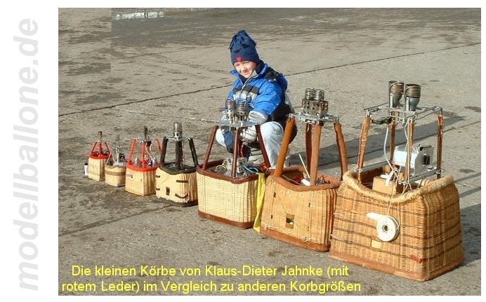 | Klaus-Dieter Jahnke aus Bielefeld baut seine kleinen Körbe und Ballone selber. Der Größenvergleich macht es deutlich - sehr viel kleiner geht kaum noch (zumindest, wenn der Ballon ferngesteuert betrieben wird). Die RC-Anlage ist im Boden des Korbes untergebracht und von der Unterseite zugänglich. Im Bild rechts dann noch einmal der Größenvergleich zu anderen Körben. | |