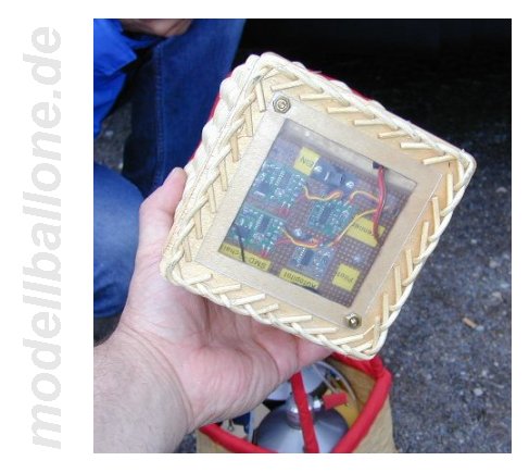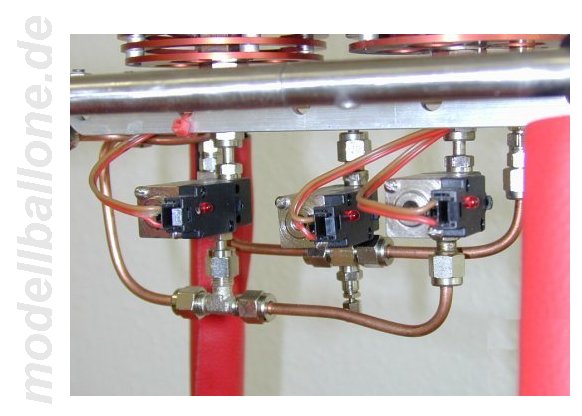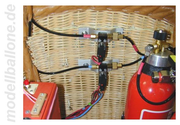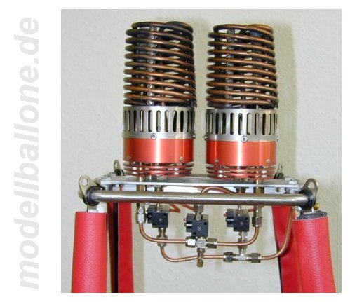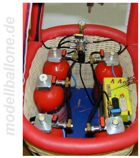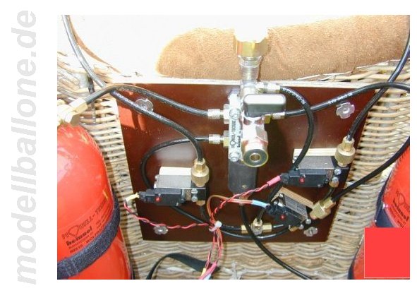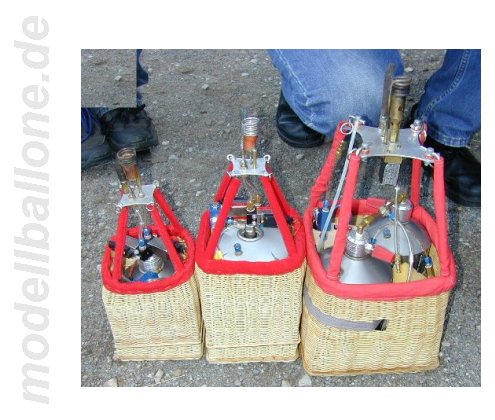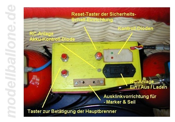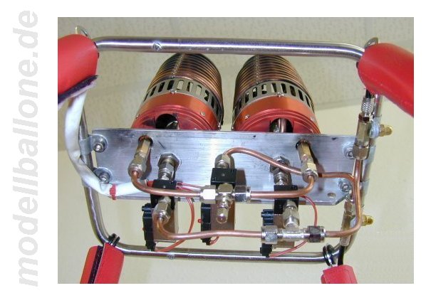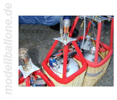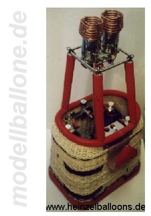 | Für die ca. 150 m³ große Hülle wird der abgebildete Korb verwendet. Bölling-Doppel-Brenner und 4 Flaschen a 2,25 ltr. Gasinhalt. Die Magnetventile können per Hand von außen über die Mikroschalter betätigt werden - die RC-Ansteuerung geschieht über elektronische Schalter von Conrad. | |
