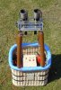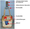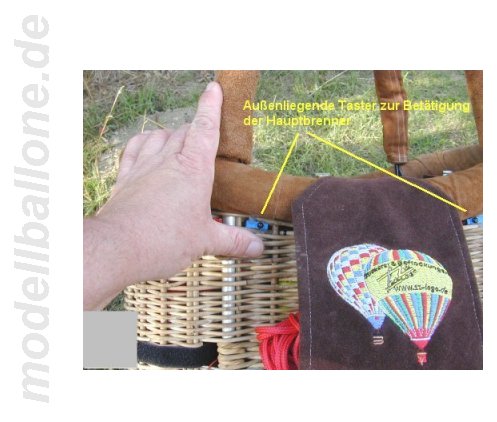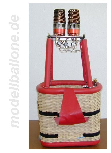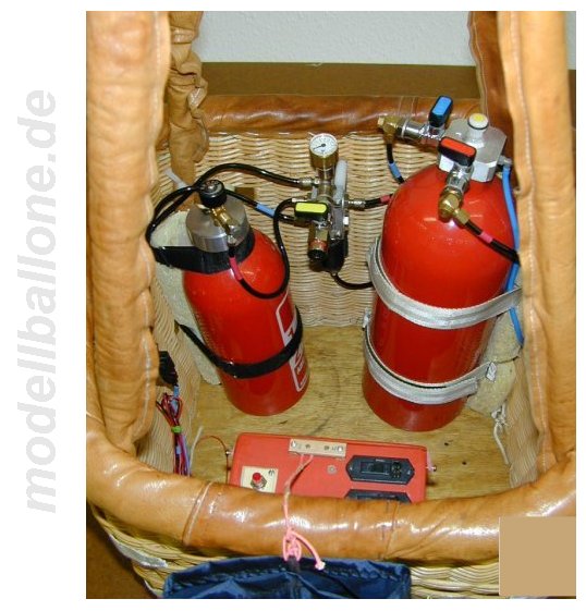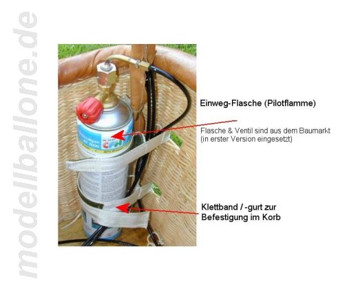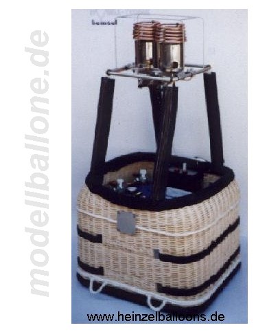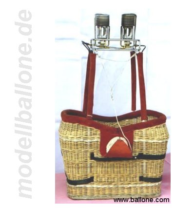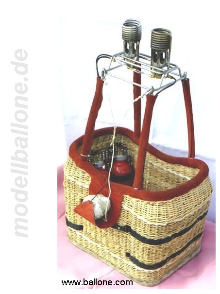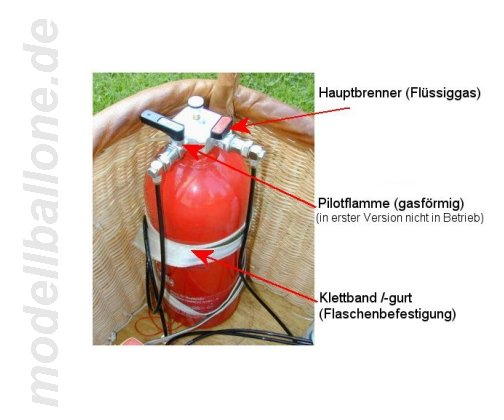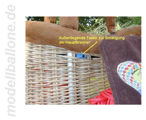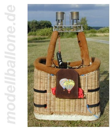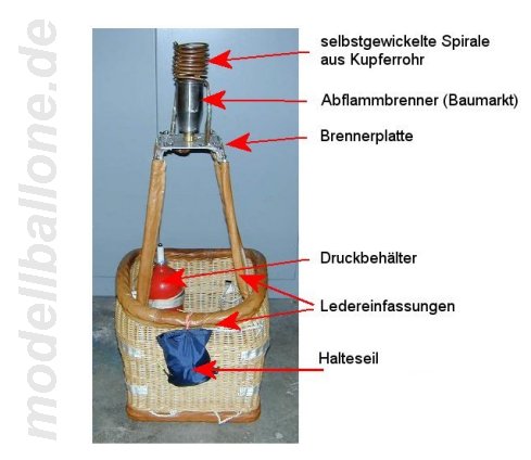 | Korb mit Eigenbaubrenner Leergewicht: 3,1 kg - ohne Flasche/Halteseil Im Innern befinden sich ein 2,0 l Druckbehälter (Hauptbrenner), eine separate Einweg-Flasche (Pilotbrenner), Steuerbox mit Ventilen und Halteseil. Die Gesamthöhe beträgt ca. 90 cm.