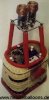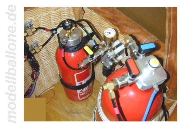 | Bei der bunten spiralförmigen Hülle kommt ein Korb, wie er auch HeinzelBalloons bei erhältlich ist, zum Einsatz. 5 Stück 1 ltr. Gasflaschen, RP 70 Doppelbrenner und das Sicherheitsschaltmodul von HeinzelBalloons sind dann im Korbinnern untergebracht. Die Magnetventile sitzen direkt unter der Brennerplatte und sind bis zum Ende des Brennerrahmen mit starren Leitungen verrohrt. | |