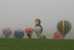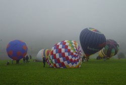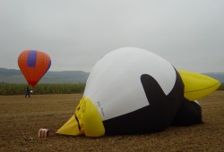 Dichter Nebel herrschte am Sonntag Morgen, sodass lange ungewiss war, ob überhaupt noch eine Wettfahrt stattfinden konnte. Schliesslich entschloss sich die Wettkampfleitung für eine kurze Doppelaufgabe: Zuerst die beliebte Geschicklichkeitsaufgabe, bei der ein waagrecht gespanntes Seil mit einem vom Ballonkorb herabhängenden Band berührt werden musste, und dann eine Fahrt zur Ziellinie. |